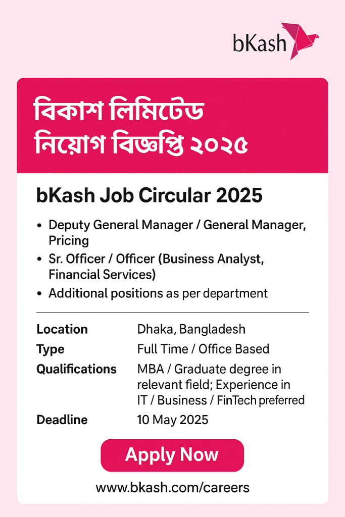 বাংলাদেশের শীর্ষস্থানীয় মোবাইল ফাইন্যান্সিয়াল সার্ভিস কোম্পানি বিকাশ লিমিটেড (bKash Ltd.) ২০২৫ সালের জন্য নতুন নিয়োগ বিজ্ঞপ্তি প্রকাশ করেছে। যারা ফিনটেক, মার্কেটিং, বিজনেস অ্যানালাইসিস বা ম্যানেজমেন্টে ক্যারিয়ার গড়তে চান, তাদের জন্য এটি একটি অসাধারণ সুযোগ।