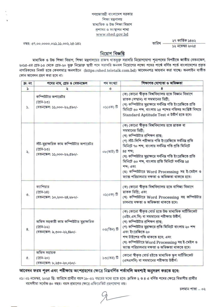 SHED Job Circular (Secondary and Higher Education Division)-এর অধীনে মাধ্যমিক ও উচ্চ শিক্ষা অধিদপ্তর বিভিন্ন অফিস সহায়ক পদে নিয়োগ দিচ্ছে। মোট শূন্য পদ ৫০০+ এবং বেতন স্কেল ৮,২৫০ টাকা থেকে শুরু করে ২২,৪৯০ টাকা পর্যন্ত। নিচে টেবিলে সম্পূর্ণ লিস্ট দেওয়া হলো: